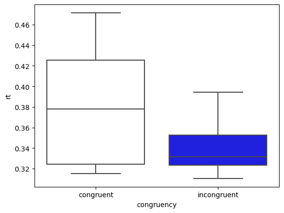 1.1 create a boxplot with seaborn for our gaze cue data where you plot reaction time by congruency with the colors white and blue